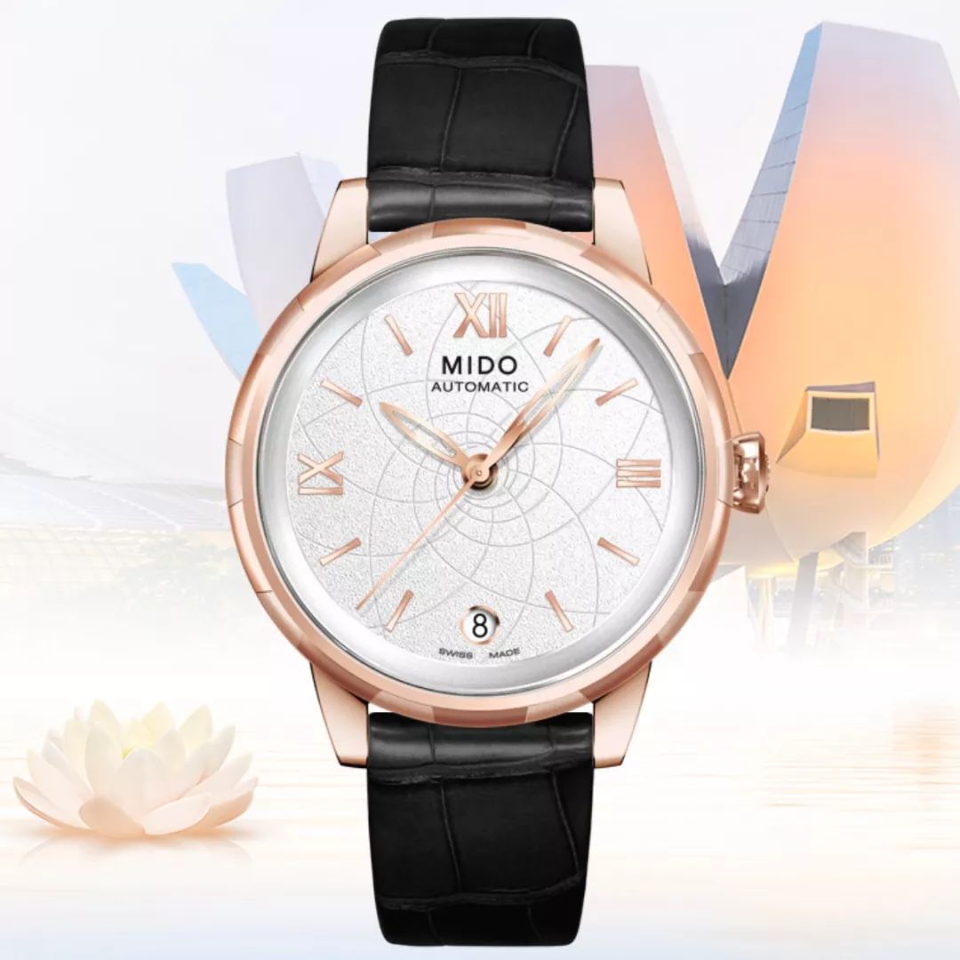 简约白款以白色颗粒纹表盘饰以PVD镀玫瑰金不锈钢罗马数字刻度,搭配黑色小牛皮轧鳄鱼纹表带,精雕细刻的机芯,自动摆陀装饰有花淅系列专属的图案花纹和MIDO标志。