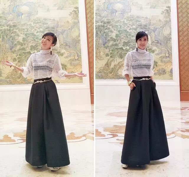 米雪内搭抹胸在罩衫的笼罩下若隐若现,性感撩人,看来女人味这件事真的和年龄无关。下配的黑色长裤也颇有讲究,既配合了抹胸还和上衣形成白加黑组合,再用金色腰带点亮全身,知性大气。