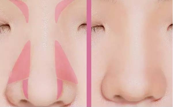 鼻头塌的宝贝呢,要重点在鼻翼两侧打上直三角的阴影,接近鼻头的位置也不要忽略,再配合眉头部分的阴影,这样才能打造精致尖鼻头的即视感。