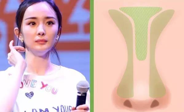 如果你像大幂幂一样鼻孔比较明显也不要着急,首先给你的鼻梁中央打亮,然后沿着眉头至鼻头两侧扫上厚重的阴影。总之目的就是转移大家的视线,把焦点集中在高挺的鼻梁上。
