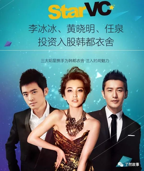 2014年7月11日正式推出Star VC明星风险投资机构,是李冰冰与任泉、黄晓明共同组建的。三位创始人希望把它经营成投资品牌,并且希望有更多明星加入,与其他VC强强联合。当月Star VC 与韩都衣舍成功牵手。