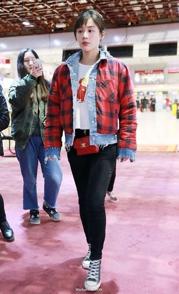 马思纯现身北京机场,身穿Amiri两面穿的格纹拼接牛仔夹克,内搭Re/Done白色T恤,脚踩Converse高帮帆布鞋,腰包来自Chanel。