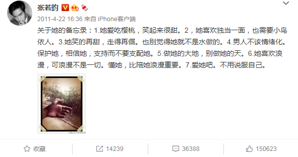 2011年,两个人都还是寂寂无名的小演员时,彼此依靠。张若昀手机上更是写满了关于“她”的备忘录。比如,她爱吃樱桃,笑起来很甜。这些后来被网友扒出后,让人觉得酸掉大牙。但这就是张若昀表达爱情的方式。