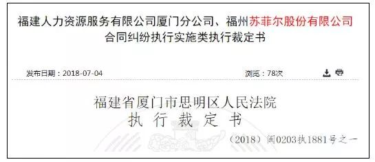 其中,根据今年7月的一份福建省人力资源服务有限公司厦门分公司、福州苏菲尔股份有限公司执行实施类执行裁定书,厦门市思明区人民法院依据已经发生法律效力的(2017)闽0203民初2552号民事判决书,向被执行人福州苏菲尔股份有限公司发出执行通知书,但被执行人至今未按执行通知履行生效的法律文书所确定的义务。