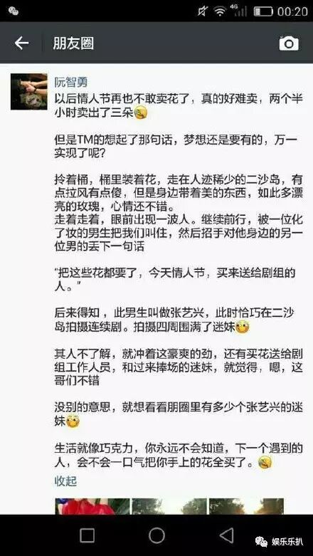 张总在情人节当天,罔顾自己单身的哀怨与悲痛,包下了某位卖花的小哥的全部花,送给了剧组的工作人员,真是一击温暖的暴击,早知道如此小编就丢下一切,奋不顾身地日夜蹲守在剧组附近,当一个卖花的小姑娘了