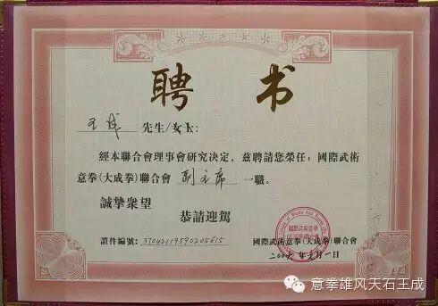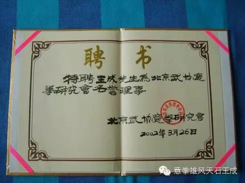 聘天石王成先生北京市武协意拳研究会名誉理事