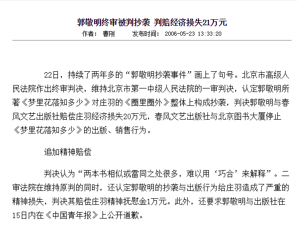然而法院在2006年就认定了的抄袭,十年过去了,郭敬明依然没有道歉。