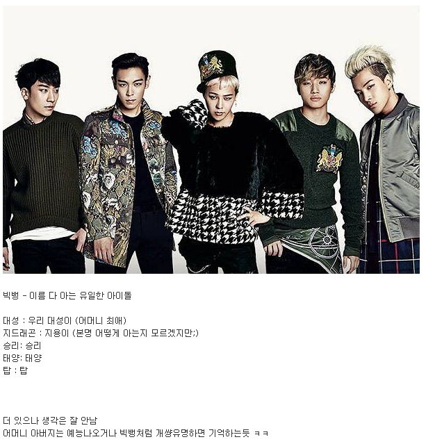 该博主只列举了这三个组合,她还表示:“父母辈的只记得在综艺出现过的人,或者是像BIGBANG一样巨他妈有名的那种!”是的没错,巨他妈有名无疑~