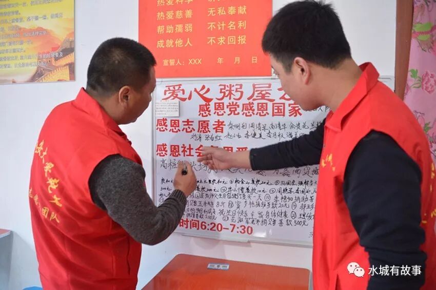 在爱心粥屋的墙上挂着一块“爱心粥屋公示牌”,上面公布出献出爱心的企业和商家、当日参与爱心活动的志愿者名字及当日收到的爱心捐赠物资等情况,小小的黑板成为一个传递温暖、文明和友爱的窗口。