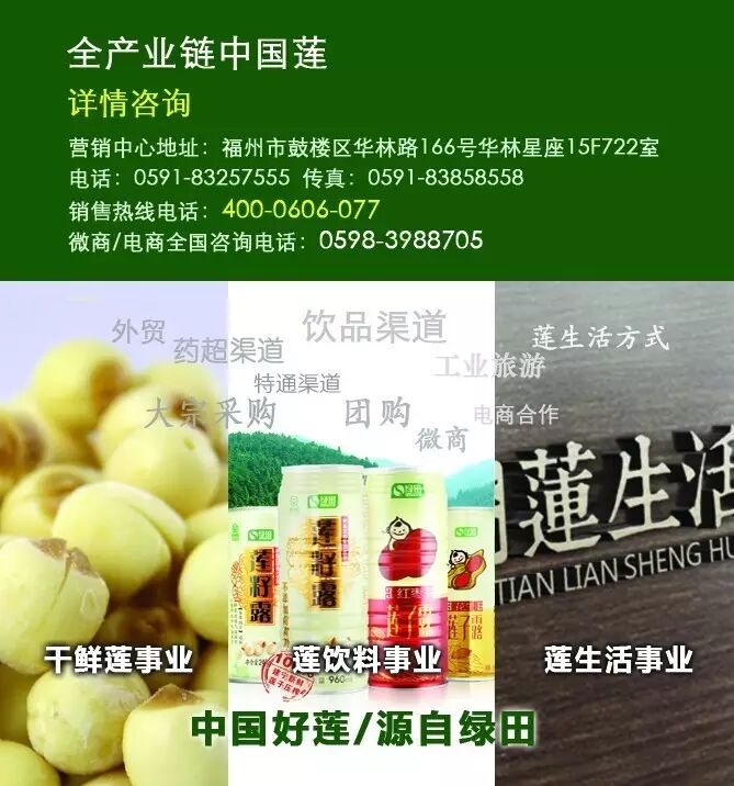 当然,在国内,绿田还有很多产品。因为我们是做中国莲子产业链的,从种植到加工,到莲饮料、干鲜莲、莲生活……