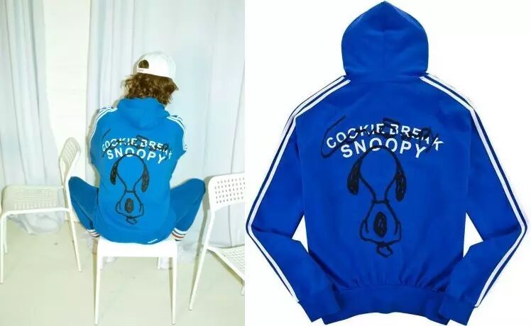 如果想全身更亮眼,那么天蓝色字母卫衣可能就是你的菜。前面采用逗趣的英文语句,后面则是 Snoopy 可爱的涂鸦形象,而且衣袖两侧还采用大热的复古校服条纹,十分惹眼。