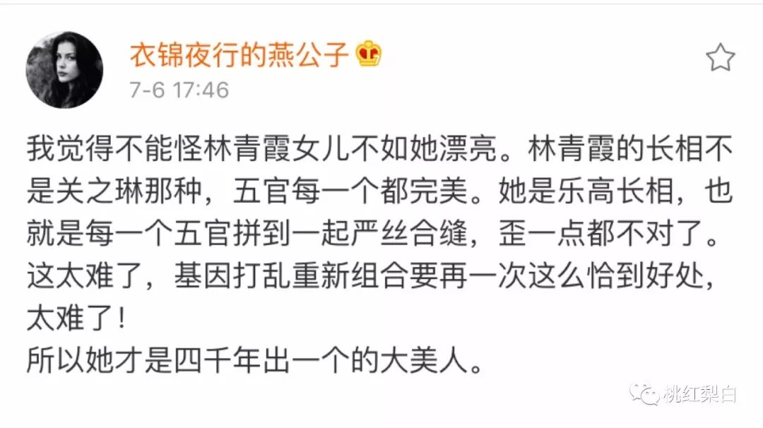 林青霞这个大女儿,怎么比她还显老? 桃红梨白 港台女星 2019-09-13 21:05:38 818 创作不易,用心坚持,欢迎请BaGua喝几杯爱心咖啡!打赏并支持本文 打赏并删除本文 桃红梨白:媒体人、专栏作家葛怡然和好友们的分享平台。公众号:geyiran666。 文丨安小鹿 图丨来源于网络上周在小号【coco桃】写了一篇明星子女基因的稿子,引发了很多互动。 最多的讨论,基本都集中在林青霞和她的女儿们身上。众所周知,林青霞算是香港黄金年代,最具代表性的大美人之一了。 当年的颜值真的没话说,是第一眼就很惊艳的长相。在这种基础上,林青霞的女儿自然从一出生就被寄予了厚望。 都想看看能不能遗传到妈妈优秀的美貌基因。 不过暂时看起来,几个女儿好像都没能很好的get到任何优势。在这里要先说明一下,林青霞现在这个大女儿邢嘉倩,并不是她亲生的孩子,而是丈夫邢李原与前妻张天爱(不是太子妃)生的女儿。 虽然不是亲生的,但和林青霞关系一直很好,经常合体参加活动,本人也很有经商头脑。就是从长相上来说,姑娘确实有点略微显老。 乍一看,总觉得比六十多岁的林青霞年龄感还重。再看最近同样上热搜的,林青霞亲生的二女儿邢爱林。 一身吊带+热裤的打扮,挺有ABC的清爽感。 看起来比姐姐青春的多,但是比起大美人妈妈,还真是没沾到什么美貌基因的光。尤其对比邱淑贞的女儿来看。 虽然同样不像年轻时候的妈妈美的那么突出,但是喊一声“小美女”还是没什么问题的。任达华和琦琦的女儿也是,才刚满14岁,一双大长腿就感觉已经预定“下一个超模”了。所以林青霞的女儿们,在遗传方面确实没占什么优势。也因为这组照片的曝光,引起大家在网上各种热烈的讨论。 看到一个理论还挺有意思的,说林青霞这样的长相,其实有点“乐高脸”的感觉:所谓的“乐高脸”,就是单个五官并不十分惊艳,但是组合在一起却美的不得了。 看下林青霞的照片,好像确实有点这个调调的。虽然林青霞的整体五官长相都没话说,但如果要是一个一个单独看的话,她的五官只能说是每一个都很标致,但并没有特别完美或独特的感觉。 对比单个五官都很惊艳的关之琳,林青霞其实还是比较偏整体氛围型的美女。看年轻时关之琳的眉眼五官,基本都是单拎出来,本身就已经足够美艳的存在。 组合不组合的,对她来说没有太大的影响。陈红也是这种类型的美人。 双眼皮、翘鼻子、大小厚度刚好的嘴唇,每一个五官都生的挺完美。还有范冰冰,脸上几乎挑不出任何bug。 曾经一度是年轻女孩们的“整形模板”。以及年轻一代的娜扎还有迪丽热巴,都是这种每一个五官都“独自美丽”的样子。对比来看,林青霞的美,和她单个五官的美艳程度,却没有那么大的联系。 甚至还被说过脸大的问题。但是就是这种单独看起来仅仅只是标致的五官,组合在一起却怎么看怎么舒服美丽。 所以说林青霞这样的脸,和拼接组合的乐高,是有点异曲同工之妙的。和她一样的类型,其实还挺多的。 比如章子怡:她的长相是标准的“三庭五眼”的配置,眼睛不会过分的大,鼻子也不是特别高挺的模式。 但是她的骨相是很优越的,组合在一起,这种天生最适合大荧幕的“电影脸”,真的羡慕不来。还有舒淇,如果说林青霞和章子怡只是单个五官美的没那么显眼的话,那舒淇就真的是五官单拎出来都不太能打的代表了。眼睛不大,眼间距又有点开,在《非诚勿扰》里被葛大爷调侃:像比目鱼。鼻子有点塌、嘴巴过大、脸型也不是小巧上镜的类型。 这种五官条件,单看任何一个都挺让人摇头的。 连她自己也说过,早期会在容貌上有点不自信。但就是这样的一脸五官条件,排列组合在舒淇脸上,却总有种说不清的风情。 做好妆发,甚至会有点油画少女的感觉。一样同属“鲶鱼系”长相的倪妮,也是这个类型的。 细长的眼睛+偏扁平的脸形,倪妮的五官也是“重在排列”的模式。但就像舒淇一样,她的美也不需要通过五官和眉眼去“硬碰硬”,只要氛围到位,可以美的很轻松。 所以她也是典型的“乐高脸”,虽然眉眼五官都不是完美那一挂的,但从外形上是完全不会影响她任何美感的。而这种长相在遗传基因上,就表现的非常不明显了。 以林青霞为例,她的这种组合式的“乐高脸”,成形的条件真的蛮严苛的,简单来说就是命好,正好组合搭配在了刚刚好的“神颜”的模式。但这种颜值想要完完全全、刚刚好好的遗传给下一代,却是个相当艰难和不确定的工程了。 尤其遗传基因,还是来自父母双方的。 而林青霞的老公长这样:真心不能算是好看的长相。 再加上“女儿像爸”这一遗传特性,林青霞亲生的两个女儿,在颜值上无法和自己妈妈比拼,就是相当正常的一件事了。因为遗传基因其实是有“显性”和“隐性”两种表现的。 显性表现是R为表现基因,隐性表现是r为表现基因,其中单双眼皮、高矮个子、肤色、会不会秃头等,都是比较显现的遗传基因。所以陈红这种自身各个五官都很能打的模式,生出来的孩子就比较有遗传优势,可以沾到更多来自父母美貌的光。 再加上和前面“女儿像爸”相对应的“儿子像妈”的遗传模式,所以陈红的儿子陈飞宇,算是星二代里比较会长的例子了。对比来看,林青霞的两个女儿就会比较吃亏。 妈妈的美貌不能直接复制,爸爸在长相上又没有什么优势...... 作为女儿来讲,大部分遗传基因还恰巧来自于爸爸