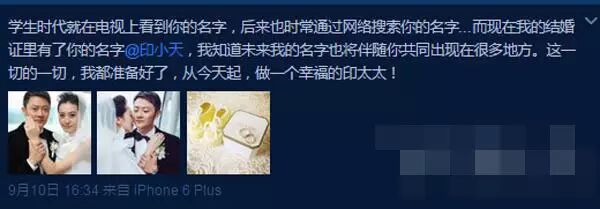 结婚那天哈琳娜发了个微博,说自己上学的时候在电视上看印小天这个名字,现在这个名字出现在了结婚证上。