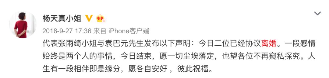 2018年9月24日,张雨绮与丈夫袁巴元发生冲突,拿刀将其砍伤,9月27日杨天真小姐就在微博上替两人发布离婚声明: