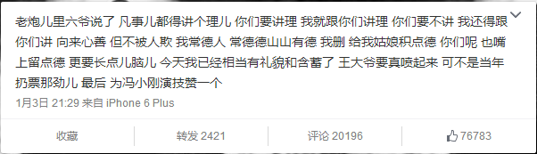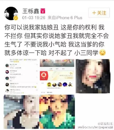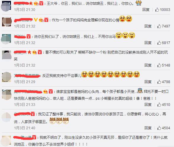 本是与粉丝一同见证女儿成长的好心情,却因为某网友留言“真丑”,一时间惹火了护女心切的王栎鑫,在网上怒挂该网友的照片,并附文“你可以说我家姑娘丑,这是你的权利,我不拦你,但其实你说她爹丑我就完全不会生气了,不要说我小气哈,我这当爹的你就多体谅一下哈,对不起了,小三同学!”