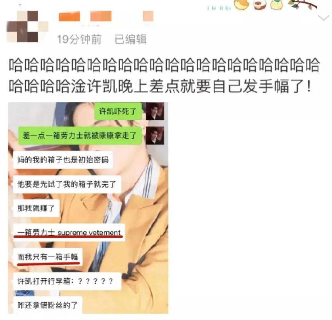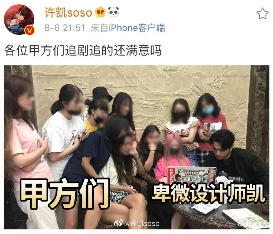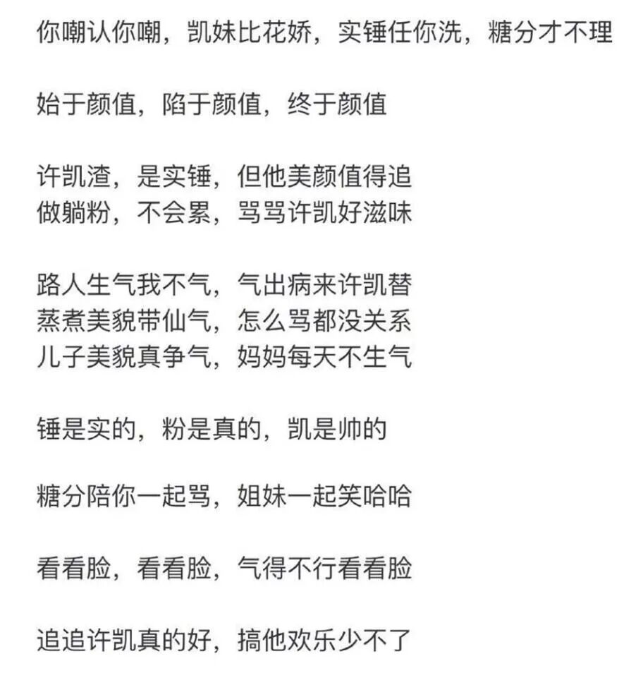 没人能活着走出许凯和他粉丝的故事 谈资 内地男星 2022-12-24 22:00:54 265 创作不易,用心坚持,欢迎请BaGua喝几杯爱心咖啡!打赏并支持本文 打赏并删除本文 编辑 | 周三三许凯算准一线吗?没想到他和同公司女艺人的恋爱瓜竟然无人伤亡……稍微展开讲一讲许凯的这个择偶小癖好。他好像唯爱吃窝边草,从小透明时期跟张南传绯闻,到最红那一年传白鹿,再是现在这位名儿都没听过的赵晴,全跟他是一家公司的同事。哪家的呢,于正的欢娱。但许凯真真儿闹大的一桩恋情,反而不是同行,是跨行来的叫大金的网红。惹上网红的男明星,甭管冤不冤,下场总不会好过。许凯当时也险些被大金的“家暴”一锤锤成残废。可最后,他怎么就奇迹般地站了起来,重新做人了呢?因为粉丝,许凯有一帮粉丝,是比许凯本凯更大咖的存在。这次闹新绯闻,许凯的粉丝、站姐也连着一串儿上了热搜。是不是买的不知道,至少效果好,没人再揪着许凯扯皮了,全扎进了他和粉丝的喜剧往事里笑得头掉。这可真是内娱饭圈不多的追星的快乐啊。1. 如果你是从这一两年开始熟识许凯,尤其还不慎点过《千古玦尘》,或许是不太能理解这张脸有什么好值得发疯的。许凯的“值得”比较被公认的一次,应该是《延禧攻略》。他摆在里头,真挺下蛊、挺有迷惑性的。有点晃眼吴X凡,两人的眉眼与身架,看着像来自同一个妈的帅哥基因。但帅的流派又很不同,吴X凡属于时髦海王系,许凯……当时吃惊这是好正人君子一男的啊。死丫头当时也真的会写,写这个傅恒既出身名门,是白月光皇后的弟弟,又秉性一流,连姑娘的手腕伸到面前也会别过脸去不看,吞吞吐吐说“不得体”。干净、正直、善良且禁欲,你会发现,永远可以万无一失戳中女观众心尖儿的偶像剧男主,变来换去总躲不过一个唐僧。所以在被于正割韭菜的2018年,发一点傅恒疯太正常了。然后大金就蹿出来了。导火索是白鹿在ins上秀许凯送她高跟鞋,大金跳出来说鞋背后的床单是她买的。那局面就很像许凯一边谈着现女友一边被前女友抓小辫儿。来回拉扯的过程中,蛮多来自大金的指控对许凯都是致命伤。尤其疑似家暴的照片一丢出来,真假其实不那么重要了,重要的是,许凯这颗冉冉升起的新星转眼要成流星了。谁受得了啊,电视上的傅恒小天使,为了保魏璎珞娶了恶毒老婆,最后又为了她连命都不要了。结果演员本人被爆家暴、出轨、约炮,这剧情搁男频文里也好难逆天改命呀。但许凯的命,说烂是真烂,说好,也简直太有福了,眼见着都快沉到湖底救不活了,他的粉丝扔来了一个救生圈。居然是粉丝救了大塌房的明星,这事儿不离谱吗!2. 隆重介绍一下许凯的这帮粉丝。严格讲,她们分作了两拨,一拨来自大部队叫“泡面”。许凯出事后,“泡面”着急忙慌为主子喊冤、控评、洗白。但往往这种操作越洗越白不了。于是就有了许凯的另一拨粉丝叫“糖分”,躺着粉的意思。她们是被“泡面”踢出局,单干的一撮粉。与其说单干,不如说对着干。比如那边哭哥哥冤枉,她们就笑哥哥没女人活不了。非常经典的一次是她们聊许凯的绯闻。当时,家暴风波眼看就快翻篇了,狗仔再来一发暴击,拍到了许凯进白鹿家后再也没出来。这要按饭圈思维,脱粉不回踩真心咽不下这口气。但“糖分”怎么看这事的呢,一起在群里编排许凯,许愿他“下次找女友可以坐两站地铁再找”,笑他“没谈过异地恋”。笑吐,这话搁今天还能成立,许凯这不又没多坐两站么。所以当年,粉丝“一只清单”就向于正提出了真诚的建议:刚才说,“糖分”赶在许凯没顶前扔来了救生圈,具体那位扔的人就是“一只清单”。她是“糖分”的领头人,成立“糖分”时,敲了一篇拉普文阐述组织的追星要义。那句“始于颜值、陷于颜值、终于颜值”简直大清醒哇,总算有大粉肯承认,我家这哥哥除了脸真没别的什么了,演技、人品、努力跟他都不沾边,我图他就图他长得帅。许凯碰上脑子这么灵的粉丝,可不走了大运吗——想想粉丝与偶像的关系好妙啊,有时偶像没做错什么,摊子被粉丝搅黄,有时偶像该挨打吧,最后却能借粉丝的力翻身。羡慕就羡慕“一只清单”实在会来事,会找角度。她非但不吹嘘许凯,还对许凯实施“棍棒出孝子”的育儿经,各种举着砍刀追着许凯跑。比如骂骂咧咧催促他回关王子异。质疑他买转发。笑他靠脸约炮。当年大伙儿追星还太纯情,哪儿见过奴才跳起来打主子的追法啊,这是现在才逐渐成型、但也很难被主流饭圈接受的“辱骂式追星”。而“一只清单”算起来是“辱追”的创始人。“清单”的辱骂,也并不是毫无章法乱骂一气。像许凯爱PO一些装神弄鬼,不是,一些看书、逛展的精修图,被“清单”笑作是“管他那么多呢,这个逼我装了再说”。甚至给他立稳了“傻白甜体育生装B KING”的人设。立得多成功呢,让路人全洗了脑,以为许凯真是搞体育专业出身。求求了,哥们儿跟李诞是校友,学的还是金融。后来跑去当模特,退学了就你想过吗,“体育生”“B KING”这些热门人设,早期玩起来的是许凯家的粉丝。那时候的许凯,本人是不是好笑都无所谓了,由粉丝托着、帮衬着,他必须是好笑的。他和他的粉丝共同营造了一种好笑而自在的追星氛围。许凯给“一只清单”送生日祝福,但他不知道,那天根本不是生日,大家逗他玩的……3. 我第一次被许凯笑到,就是有一年他航班延误,于