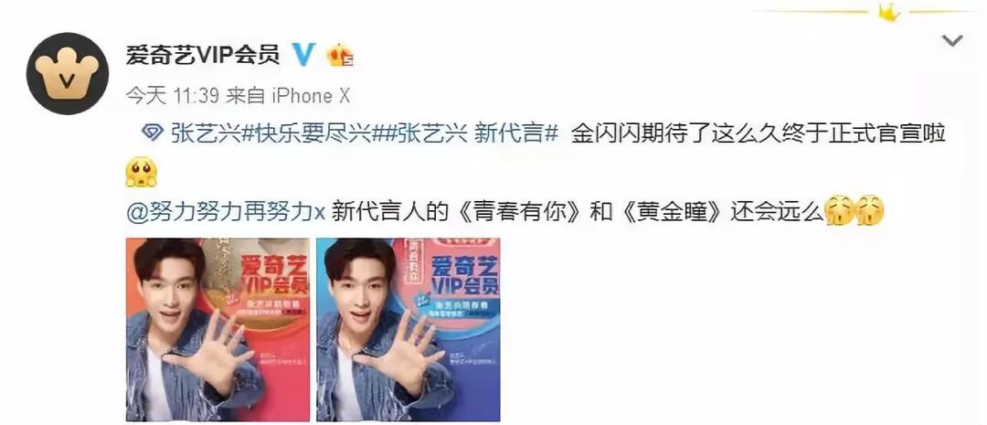 新榜讯 今天中午,爱奇艺VIP会员官方微博正式宣布,张艺兴为其代言人。