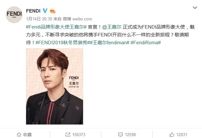 新榜讯 最近,意大利著名奢侈品品牌FENDI宣布,王嘉尔正式成为其品牌形象大使。