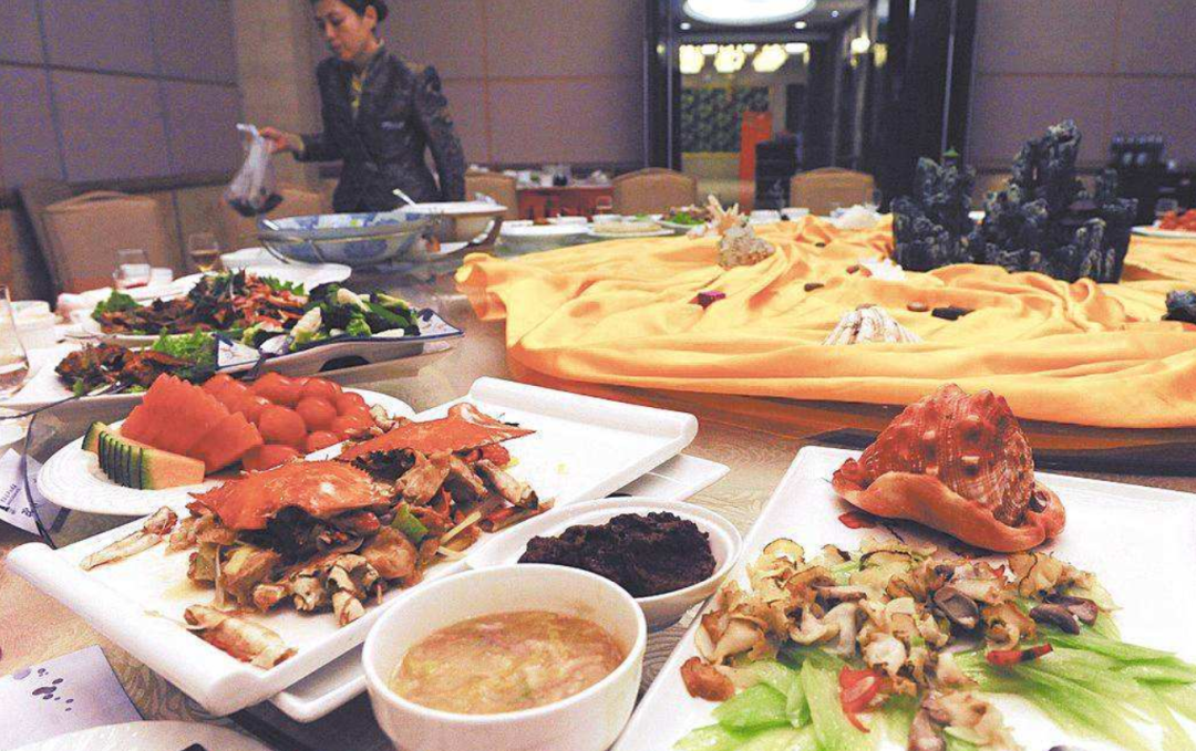 我参加过好多宴会,十几种,二十种菜,每一样蜻蜓点水吃了一点点,其它全部倒掉。