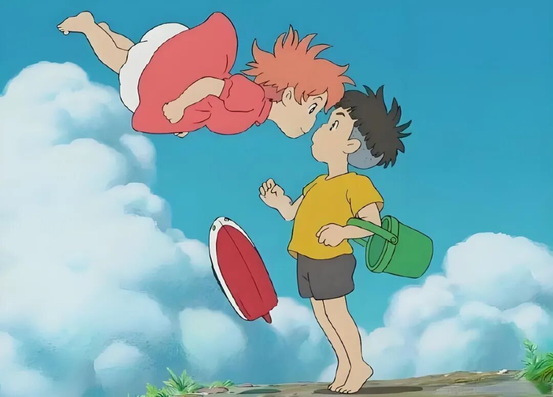 波妞踩着浪花奔向悬崖上的宗介,两人乘玩具船在淹没的小镇寻找宗介妈妈理莎。最终曼玛莲提出考验:若宗介的“爱”始终不变,波妞便可永远为人;若感情动摇,她将化作泡沫。宗介坚定回答“我会永远保护波妞”,于是波妞失去魔法,成为真正的人类女孩,与宗介一家生活在一起。