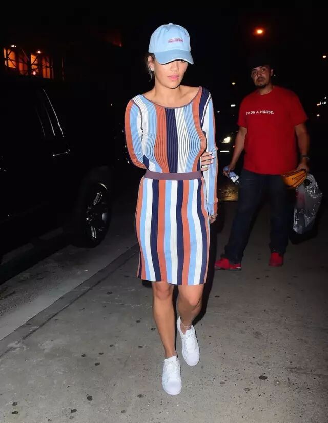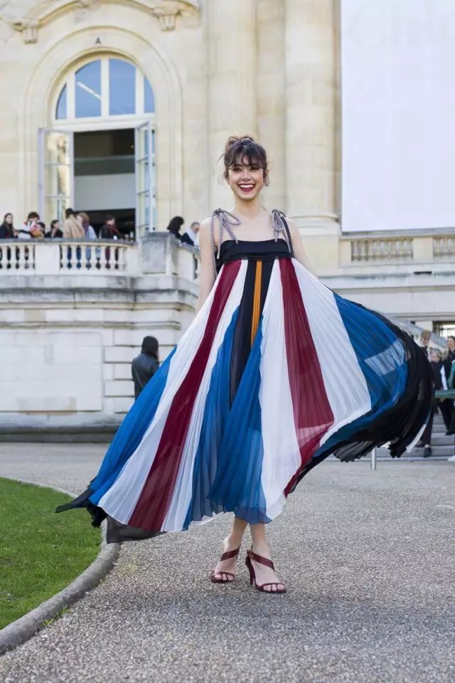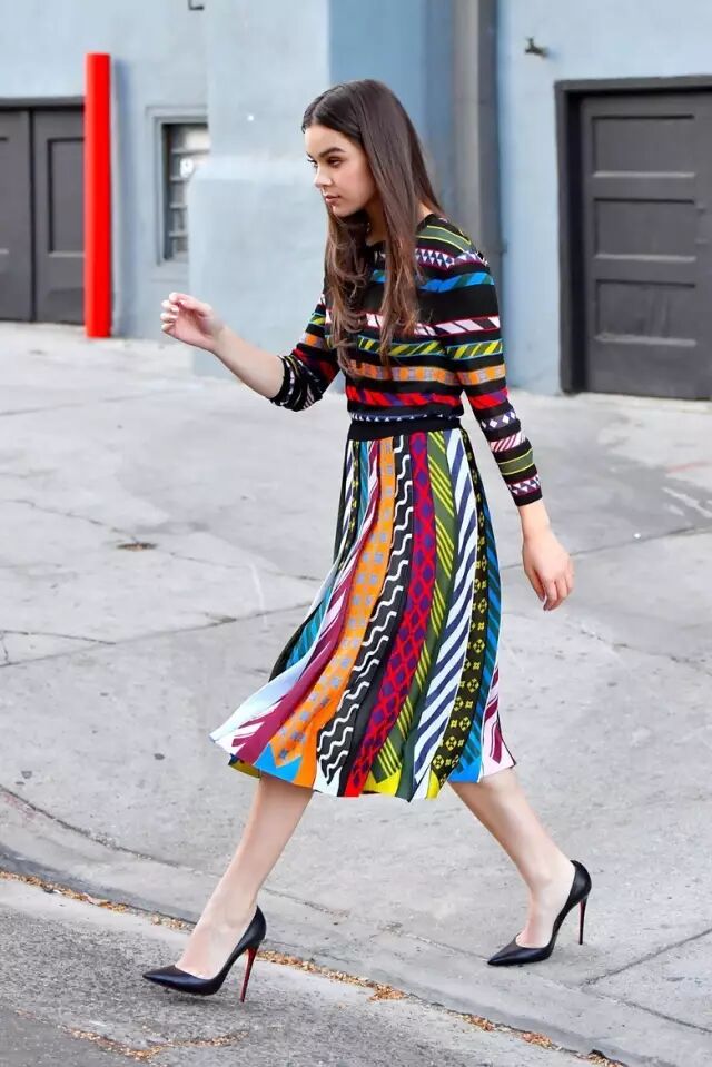 海莉·斯坦菲尔德(Haiee Steinfeld)穿拼色条纹针织衫,下搭拼色条纹百褶裙,脚踩黑色尖头高跟鞋,凸显玲珑好身材。