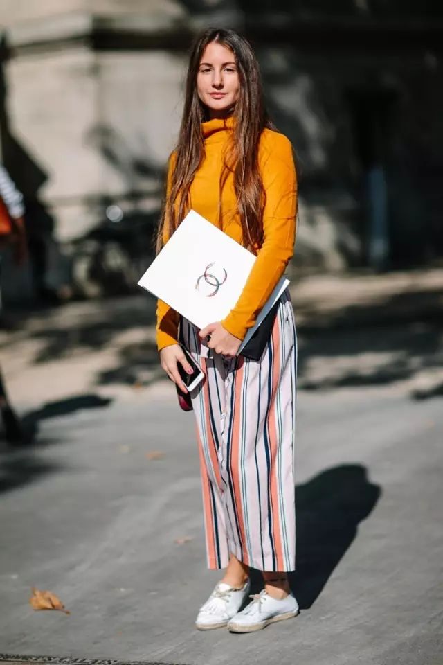 阿撒日前为某品牌站台的时候选择了一条红蓝条纹的浅色长裤搭配白色上衣,裤子上的条纹正好与衣服上的黑色条纹相呼应,简约休闲。
