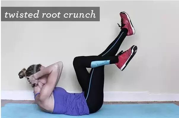 动作要领:平躺在地板上,双腿向上抬升。左腿微屈,右腿跨在左腿上(见过打坐或跷二郎腿没?)。吸气时,双手在头部支撑颈部,双肘向天花板。呼气时,双腿、头部、胸部回到起始位置。双腿交替重复10~15次。