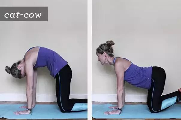 四肢着地,双眼盯着地板,脖子放松。呼吸,把脊椎向上拱起,呼气时小腿上抬,背部下塌,脖子抬头眼看前方。