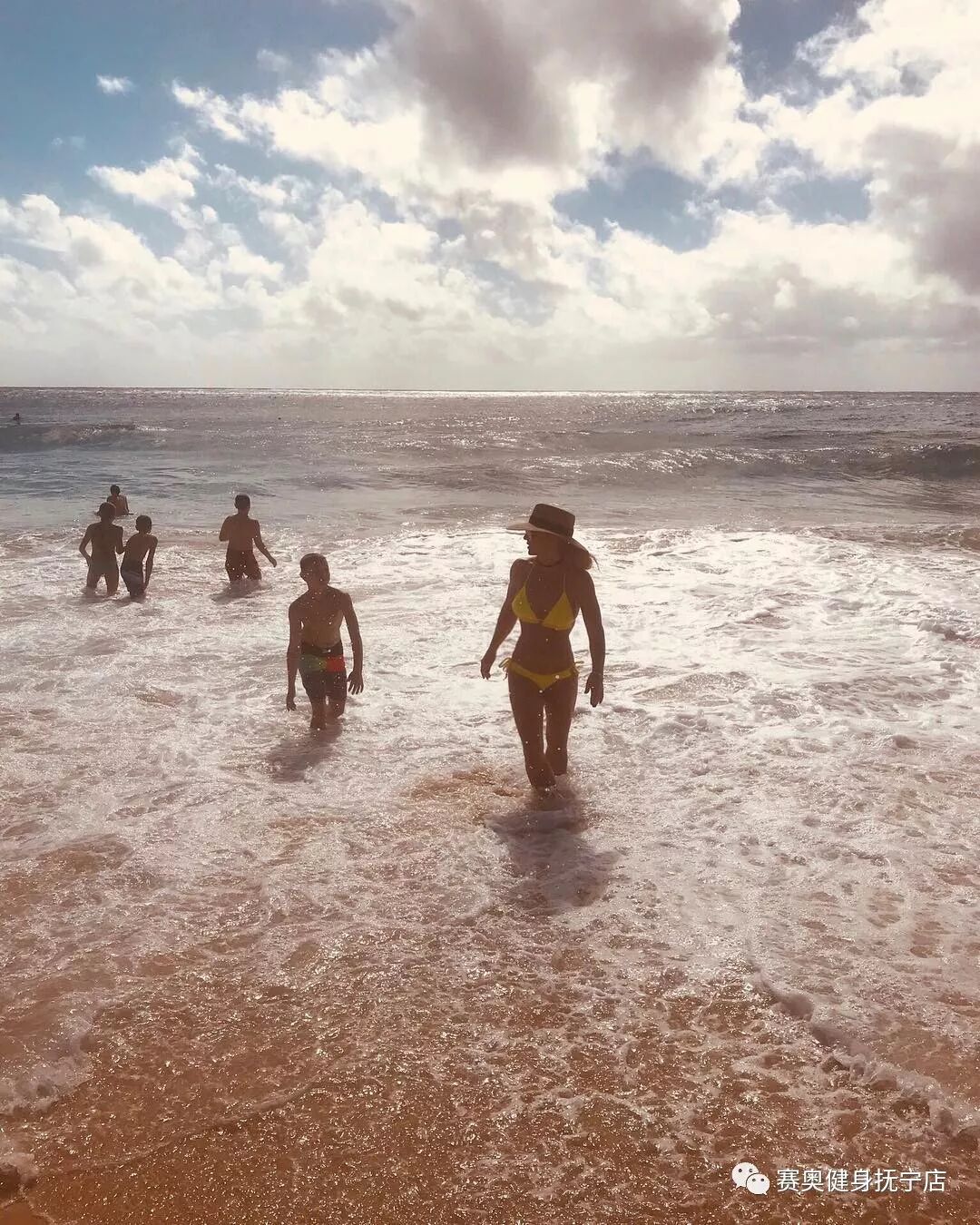 不仅“床照”,同时她还晒出和孩子一起去海边度假的照片,身穿黄色比基尼,古铜色皮肤,清晰可见的腹肌。已经是两个孩子的妈了也丝毫看不出曾经的颓废感。