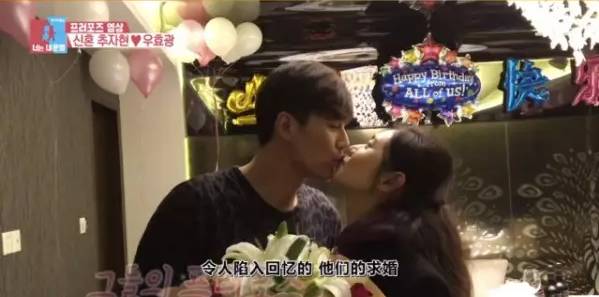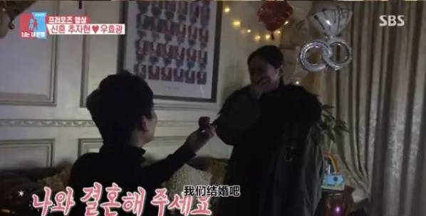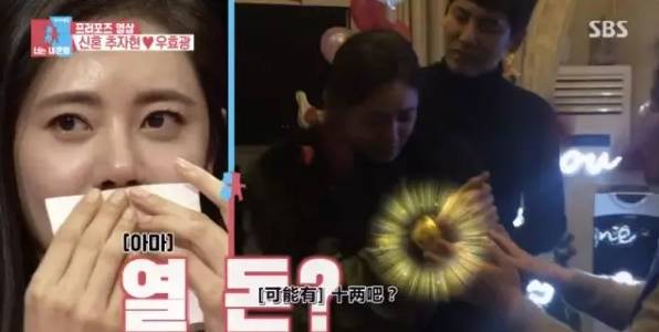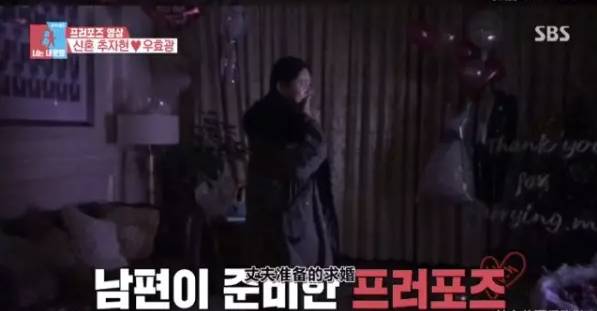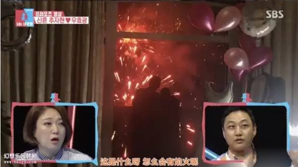 首先得说说于晓光的“浪漫”,在节目当中,还原了一段于晓光向秋瓷炫求婚的片段,于晓光亲手制作的表白影像还加上了生涩的韩文字幕,鲜花、戒指和事先准备好的烟火,让节目组感叹果然其"大规模"!
