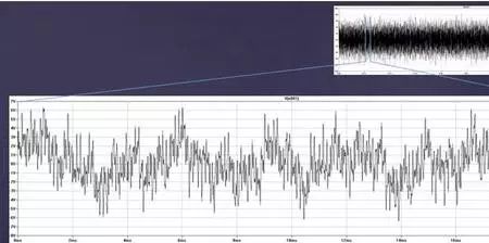 最后举一个例子,一个实际的音频信号。如下图,我采样了15秒歌手Cream的歌曲《白色的房间(WhiteRoom)》。不必为信号长的摸样担心,在EricClapton的吉他独奏期间,任何麦克风都没有损坏。