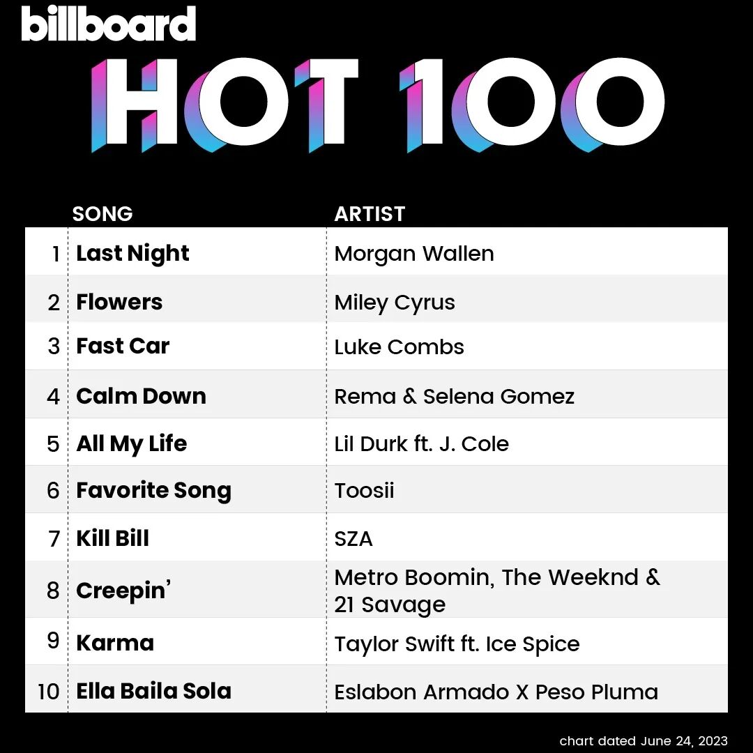 本周美国公告牌 Billboard Hot 100 榜单今日发布,麦莉 Miley Cyrus(麦莉·塞勒斯)的歌曲《Flowers》在时隔半年后依然稳居榜单第二名,已经在前三的位置停留了22周,这表明这首歌在听众中具有极高的吸引力和认可度,被广泛地播放和喜爱。同时,也展示了Miley Cyrus作为一名优秀歌手和创作人的才华和实力。