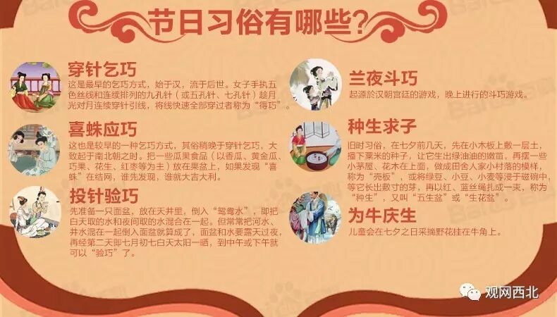 其实,乞巧节并不是纪念牛郎织女的爱情,而是纪念织女这个人,民间又称“七姐”。乞巧节是女子的节日,织女被视为纺织女神,凡间女子便在七月初七晚上向她乞求智慧和巧艺,也免不了求赐美满姻缘。乞巧的方式各年代地方皆有不同,最有名的是穿针乞巧,即谁穿针引线快,谁就“得巧”,慢的称“输巧”,输巧者要将准备好的礼物送给得巧者;蛛丝乞巧则是把小蜘蛛放在盒子中,以其织网疏密为得巧多少;明清时代流行的投针验巧是指在水盆中放入缝衣针,以盆底针影形状判断是否“得巧”。除了穿针乞巧,还有喜蛛应巧、投针验巧、种生求子、为牛庆生、晒书晒衣、供奉“磨喝乐”、拜织女、拜魁星、吃巧果、七姐诞、染指甲、妇女洗发、结扎巧姑、拜“七娘妈”。后来这个“乞巧节”还被传到东南亚以及日本和韩国。