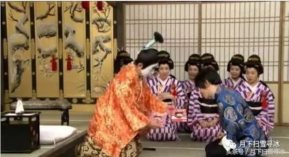 画面中,这期节目是在一间典型的日式厢房录制的,刘谦和“天皇”的身后还跪坐着日本伺女和几名身着绿色日本和服的男士,看起来对“天皇”相当的恭敬。