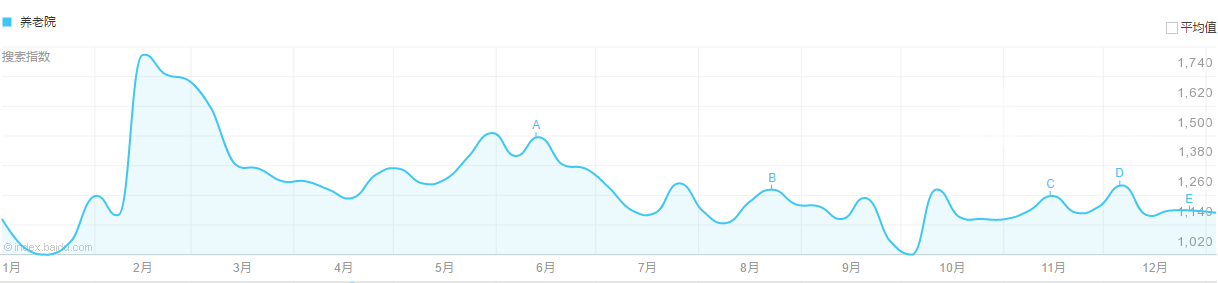 从2016年的“养老院”关键词变化来看,老人入住需求集中在春节过后的一个月,春节前两个月属于需求低谷。通过养老网合作机构咨询量和客服服务量统计,这个趋势非常吻合。