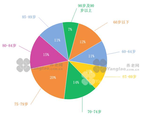 70-79岁老人占34%,比例最高。80岁以上高龄老人占33%, 值得一提的是,60岁以下人群也占到了12%。