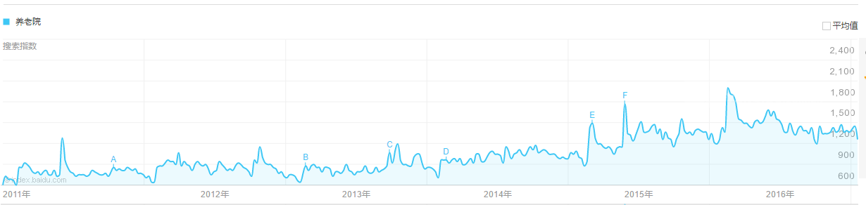 从2011年到2016年,“养老院”关键词周平均搜索指数从400上升到1200,入住需求缓慢增加。2016年入住需求较2011年翻了3倍,尤其从2015年开始增速比较快,最高点出现在2016年2月。