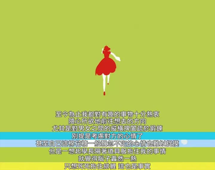 在少女看望学园祭事务长时,事务长跟她说“因为你总是不断地奔跑,所以别人才很难追上你”,少女听后说“至今为止我都对有趣的事物十分热衷,随心所欲地前往想去的方向,尤其是对男女之间疏于锻炼,别提考虑对方的心情了,甚至连自己这棉花糖一样飘忽不定的心情也难以捉摸。但是一想起学长隔着道具服抱住我的事情,就觉得的脑子突然一热,只想死死抱住绯鲤,这也是事实。”