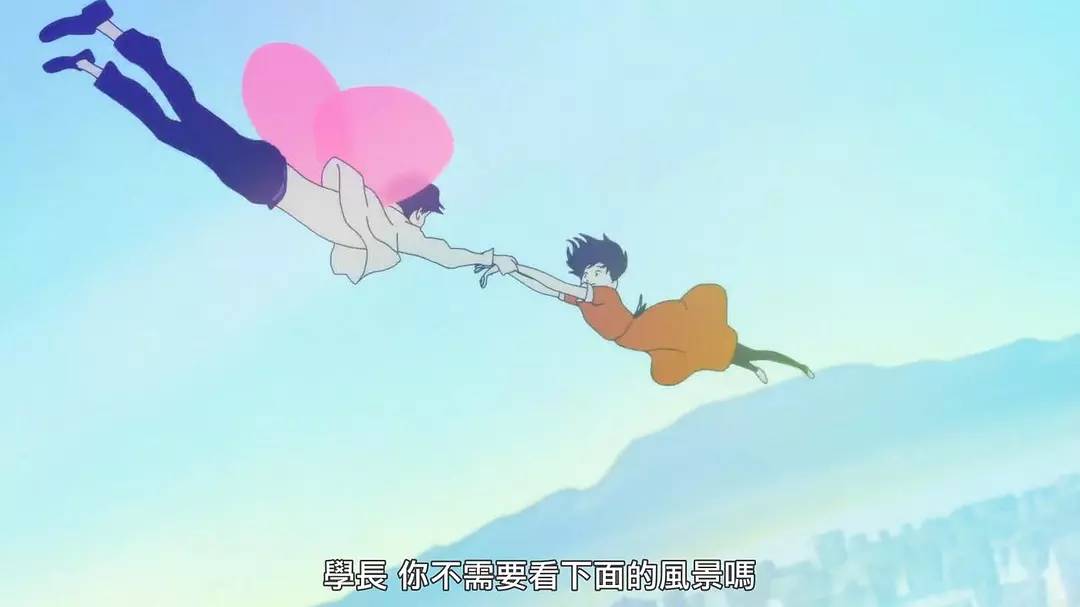 最后少女去找学长时,学长的房子变成了一个冒险岛,去往学长房间的路途艰难险阻,少女用各种她收到的礼物让那些反对她的黑暗势力冒出粉红泡泡,最后她见到了学长,学长的背后生长出爱的翅膀,他们手牵着手飘荡在京都的天空。