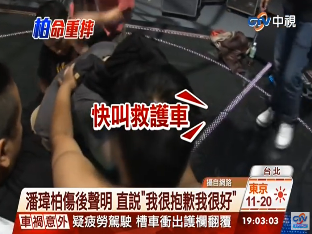 在一次演唱会上,常年唱跳的潘玮柏韧带断裂,忍痛唱完了四首歌后,立即被送到医院治疗。