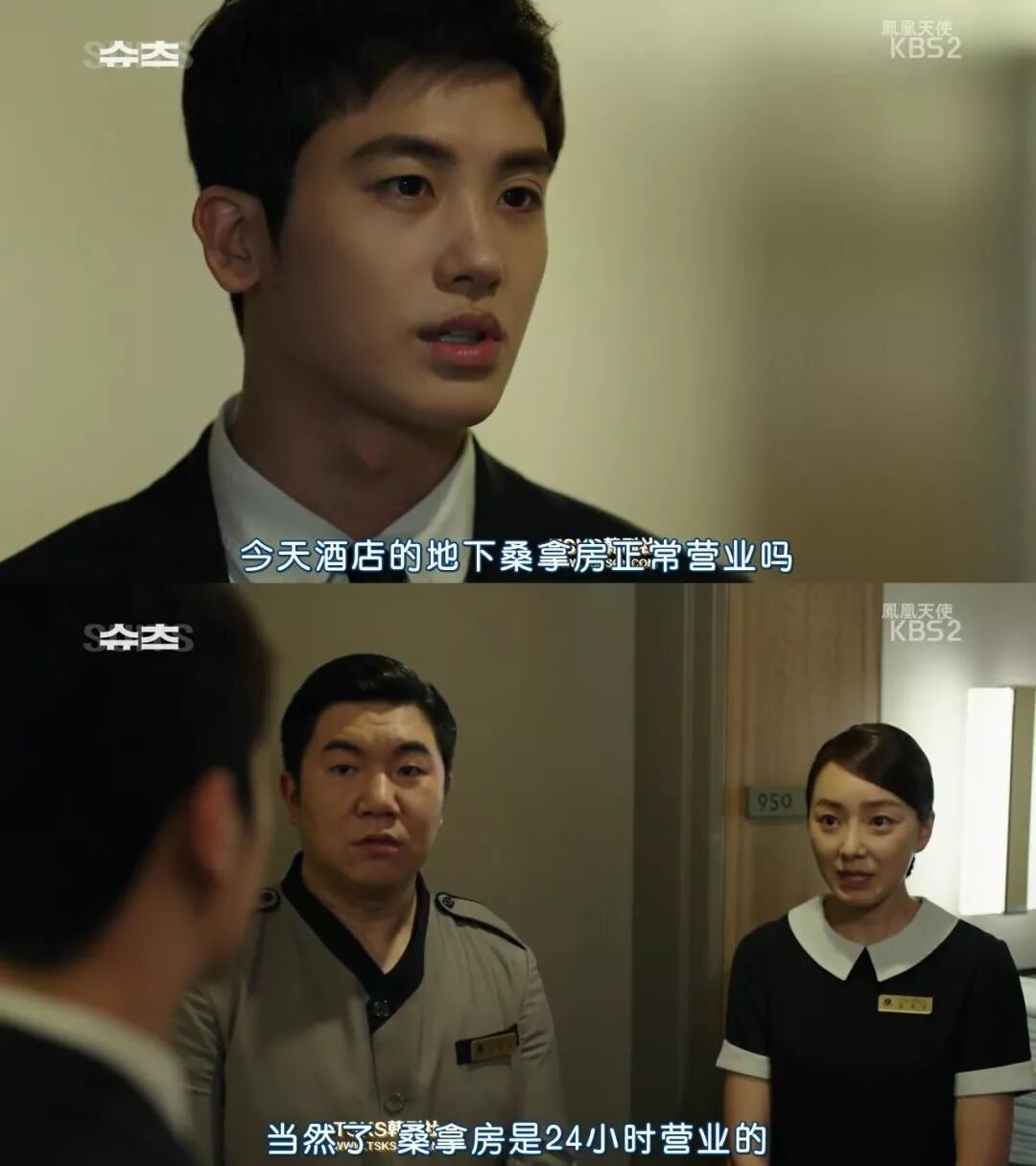 高延宇回想起电梯里贴着“桑拿房要维修休业”的告示,假装想去洗桑拿,问这两个“假员工”桑拿房是不是正常营业