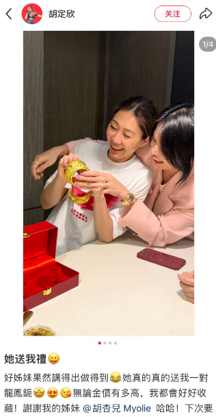 胡杏儿送胡定欣纯金龙凤镯当新婚贺礼,好姐妹说到做到:这份情谊比金价更珍贵 钱江晚报 港台女星 2025-10-31 16:13:38 6 创作不易,用心坚持,欢迎请BaGua喝几杯爱心咖啡!打赏并支持本文 打赏并删除本文 10月30日,胡定欣在社交平台晒出胡杏儿赠送的一对纯金龙凤镯作为新婚贺礼,胡定欣望着金镯子笑得合不拢嘴并配文:“好姐妹果然说到做到?她真的真的送我一对龙凤镯???无论金价有多高,我都要好好收藏!谢谢我的姐妹@胡杏儿 Myolie 哈哈!下次要戴着去做show(演出)!!! 网友评论:胡定欣,1981年9月9日出生,中国香港女演员、歌手。10月6日,胡定欣晒出婚纱照官宣结婚。据悉,胡定欣2024年底承认恋情,港媒曾曝对方叫陈健华(Akin),是一名外科医生,两人年龄相仿。潮新闻·钱江晚报记者 刘睿阳 综合自@当事人社交平台、网友评论、公开资料等责任编辑:周勤 创作不易,用心坚持,欢迎请BaGua喝几杯爱心咖啡!打赏并支持本文 打赏并删除本文 感谢您的支持鼓励,我会继续努力的!文章地址:用户邮箱:打赏金额:USDT 请输入数字点击”去打赏“,即可进行打赏支持本文章哦 胡杏儿 发表评论