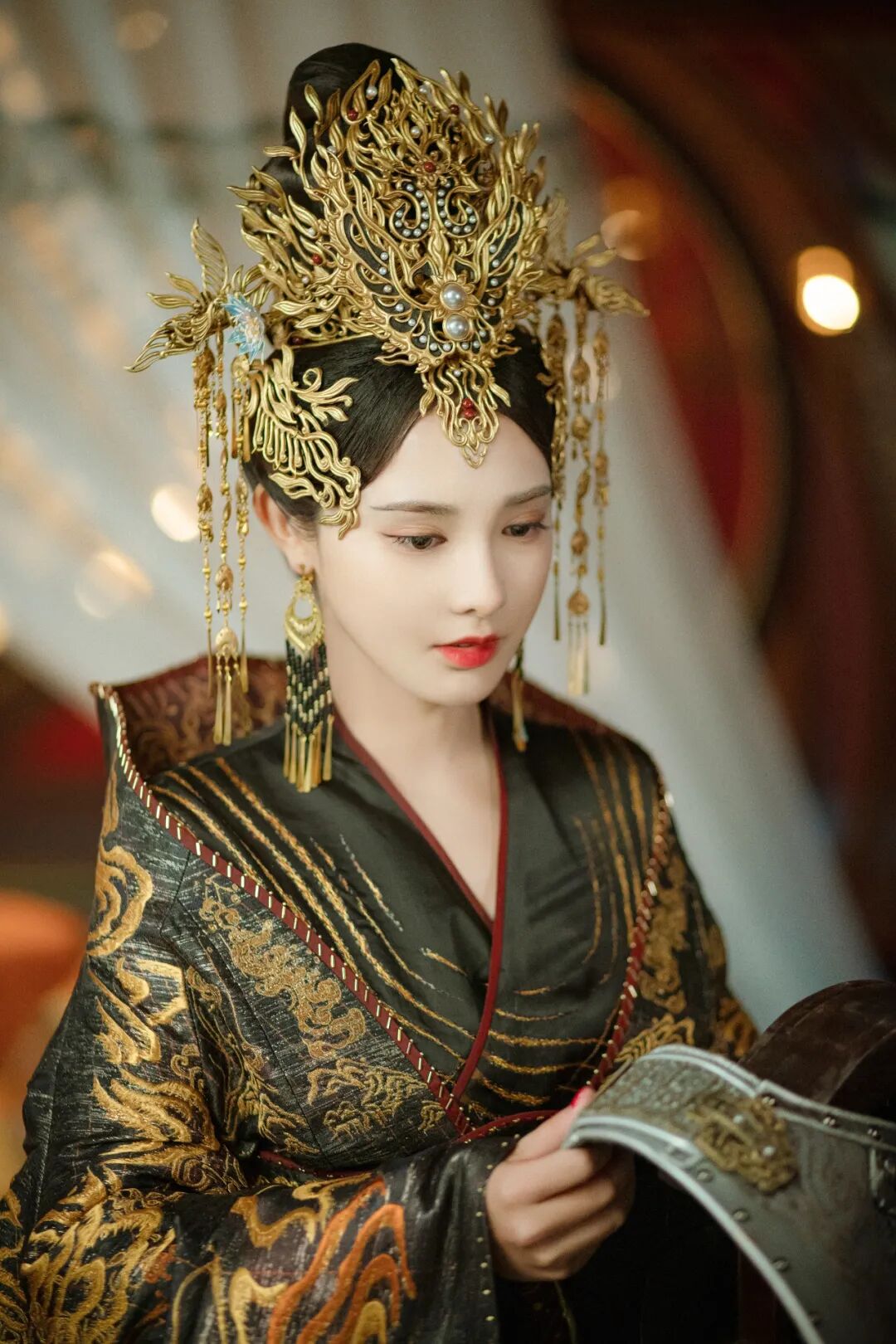 身为君后的几套造型则都是雍容华贵的类型,墨黑金绣的婚服透着优雅端庄,靛蓝鎏金朝服精致而高贵,再配上红唇艳妆,举手投足间她都自带威严;