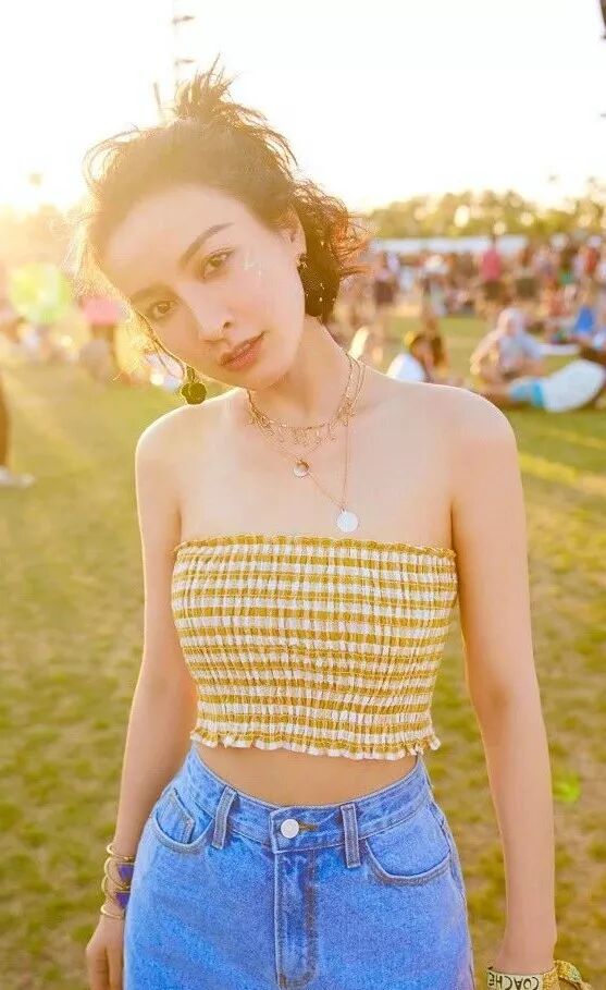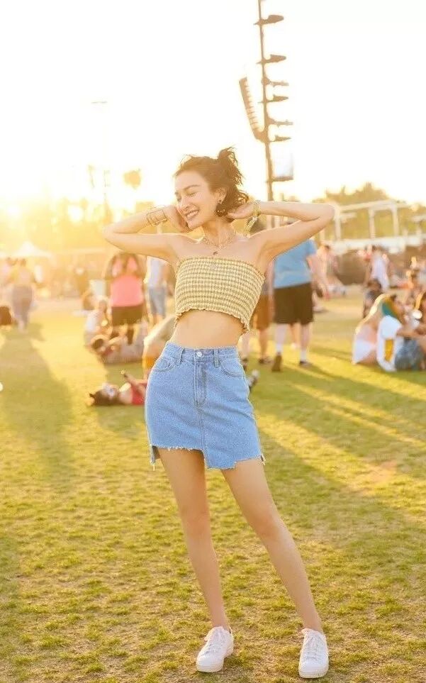 脸型也是P的圆润又不失棱角,但发型好评!这么看昕昕还是挺酷的呢。格子抹胸加浅蓝牛仔裙小白鞋,这身清新的搭配可以get出街哦~