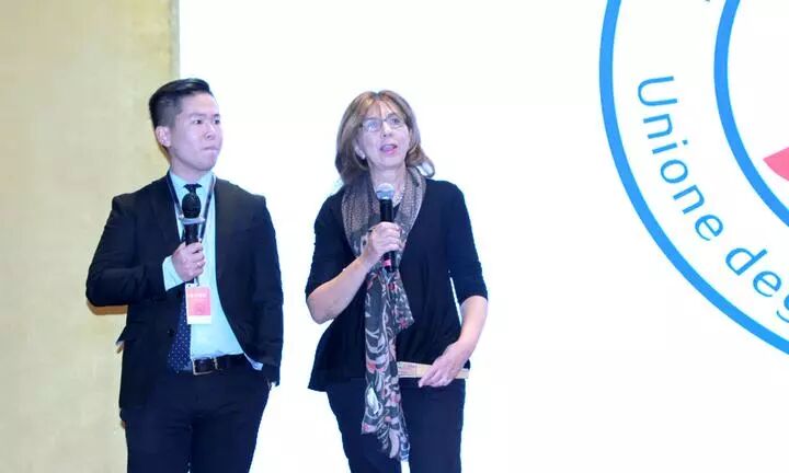 米兰大学人文学院院长艾米丽亚培拉西教授致辞,左为米大学联副主席胡仲洲(翻译)