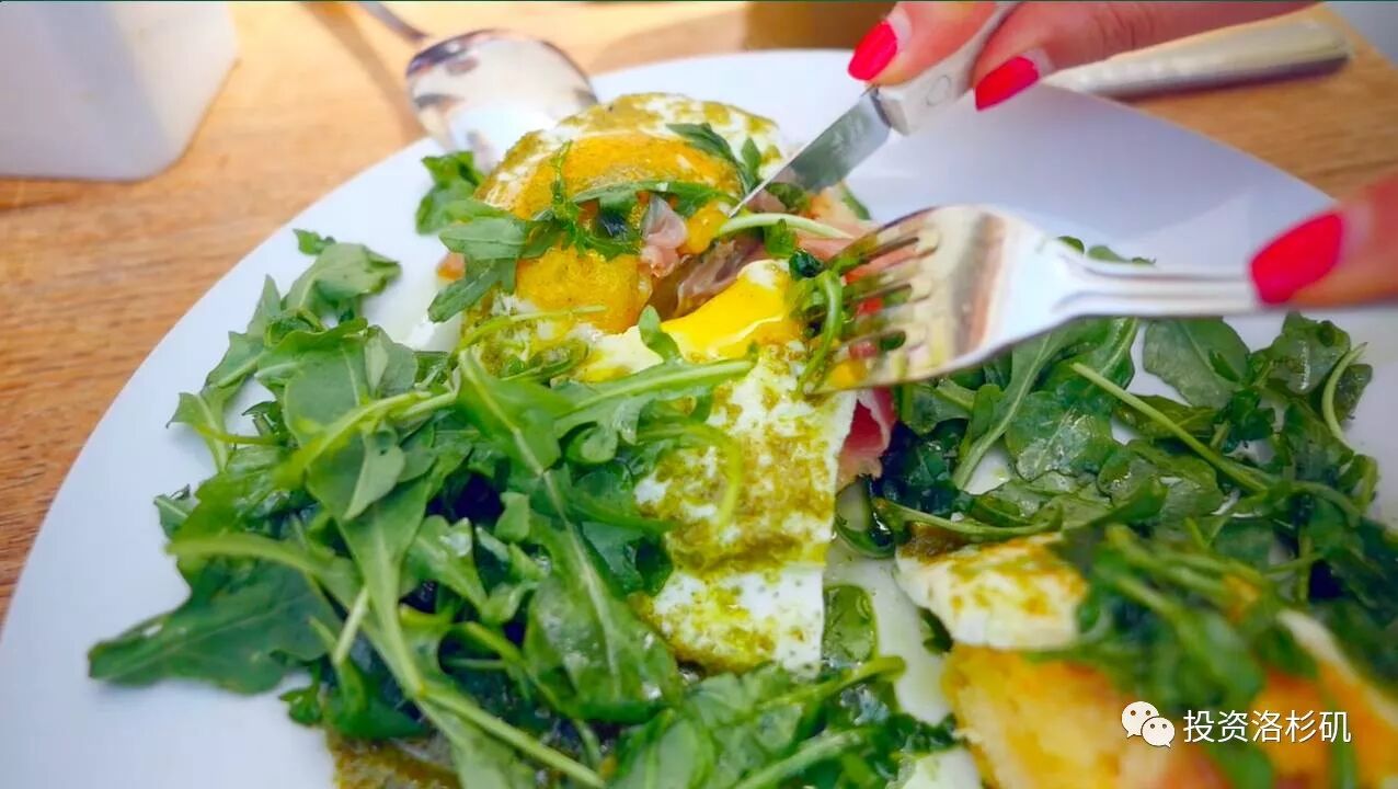 内部筋道、外部微焦的英式玛芬(english muffin)表面,被加州纯正橄榄油和绿色pesto香蒜酱浸湿了。流出的溏心蛋、意大利帕尔玛火腿(prosciutto)和葱绿色的芝麻菜, 黄色与绿色的交融看着就垂涎欲滴。一口咬了半个蛋,蛋黄溢出,余香留在唇齿之间, 只想好好回味那新鲜事物的美好味道!