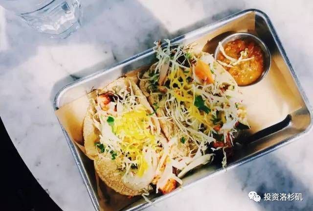 Fish taco(鱼卷)更是taco中的经典。 既然身处Venice海滩最受欢迎的墨西哥餐厅,一定要来一块鱼卷。 薄而韧的手工自制玉米饼吸收了丰富的酱汁,细丝状的蔬菜、pickled胡萝卜,搭配着大块的鱼肉,吃完一个,情不自禁的盼着第二块赶紧上桌。