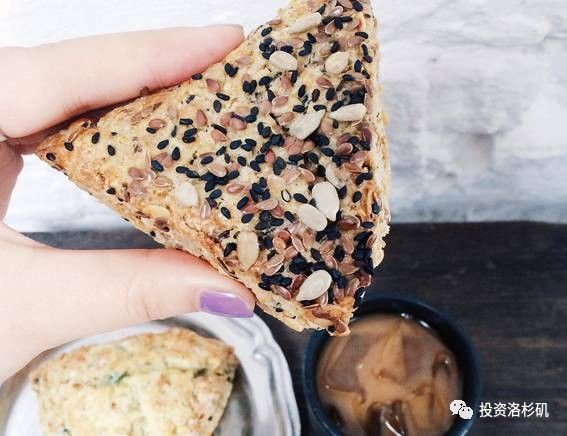 ▲ 造型别致的盘子上摆着咸香奶酪菠菜司康,手上拿着芝麻坚果司康