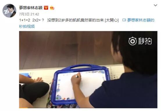 近日,林志颖在微博晒出了两个儿子在一起学习算数的小视频,并非常自豪地表示:1+1=2,2×2=?没想到两岁多的凯凯竟然答的出来!表示太开心。