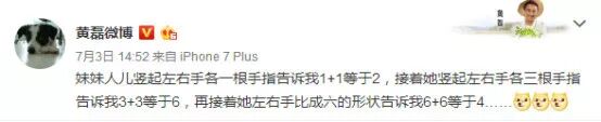 巧的是,当天黄磊也发微博吐槽自己的小女儿,而内容竟然也是关于学数字的。原来妹妹人儿先是竖起左右手各一根手指告诉黄磊1+1等于2,接着又竖起左右手各三根手指告诉黄磊3+3等于6,再接着她左右手比成六的形状告诉黄磊6+6等于4……
